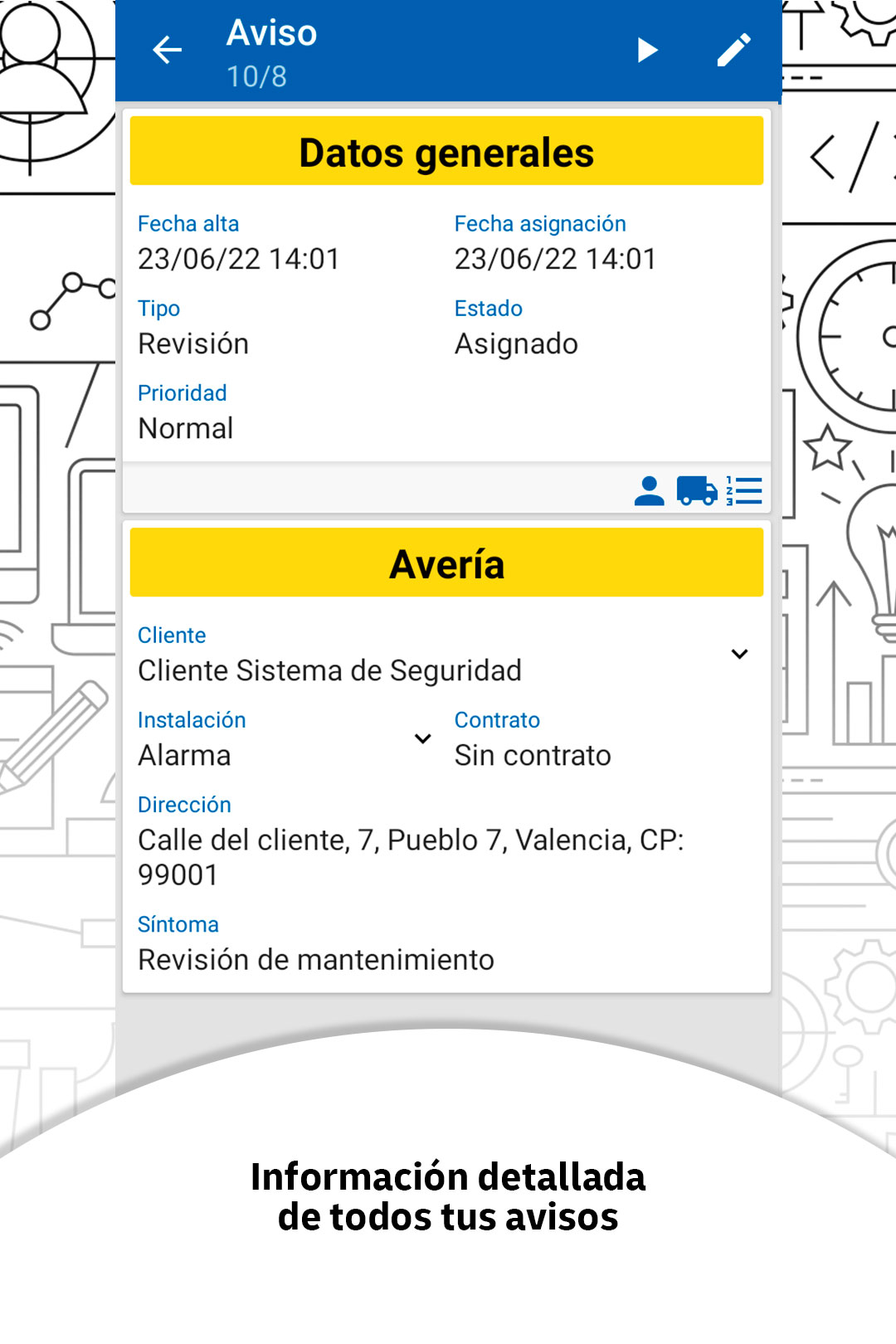 Accede a información detallada de cada uno de tus avisos. Consulta el estado, historial y seguimiento de cada solicitud, permitiéndote gestionar y resolver problemas de manera eficiente y precisa. Mantén el control total de cada aviso y mejora la productividad de tu equipo técnico.