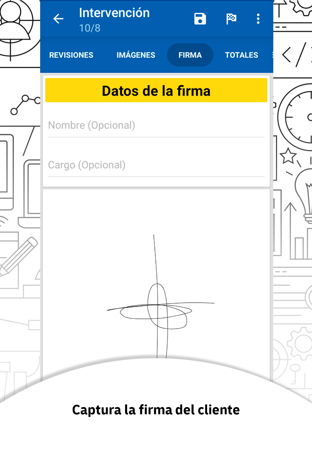 Captura fácilmente la firma del cliente al finalizar cada intervención. Garantiza una validación rápida y segura de los servicios prestados, manteniendo un registro claro y actualizado.