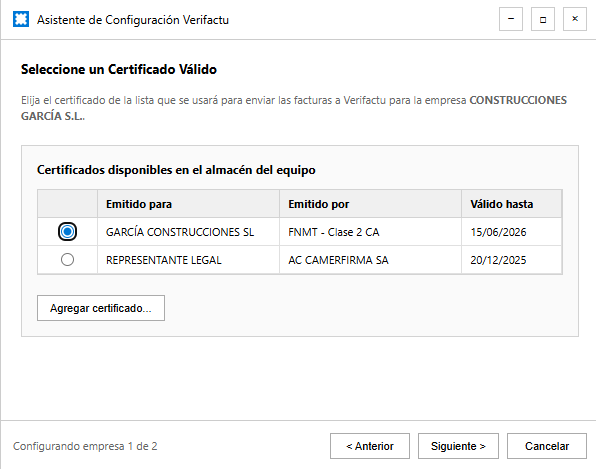 La comunicación con la Agencia Tributaria requiere un certificado digital válido. En esta pantalla, deberá seleccionar el certificado electrónico que se utilizará para firmar y enviar las facturas a VERI*FACTU para la empresa en curso.
