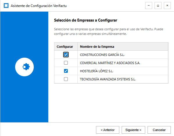 Una vez finalizados los pasos anteriores, el asistente le mostrará un resumen detallado de la configuración aplicada a cada una de las empresas seleccionadas, incluyendo la normativa, el tipo de impuesto, la fecha de inicio, el certificado seleccionado y el usuario del servicio.