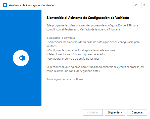 La primera pantalla le da la bienvenida y le informa sobre las acciones que el asistente realizará, como seleccionar las empresas a configurar, ajustar la normativa fiscal, seleccionar los certificados digitales y configurar el servicio de envío.